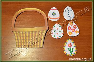 Мир материнства. Очень и очень оригинальная поделка, только моей крошке не хватает усидчивости, чтобы клеить кружочки на яйца. Мы нашли выход из положения и просто их раскрасили фломастерами. Так как нет принтера, мы нарисовали корзинку и прочие заготовки самостоятельно, но всё равно получилось достаточно оригинально.
