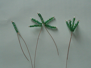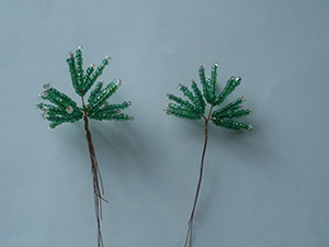 Берем кусок проволоки длиной примерно 30 см, нанизываем на проволоку 9 зеленых бисерин, 1 белую. Затем проволоку пропускаем в обратную строну, только через зеленые бисерины, белая остается на кончике иголочки. Одна иголочка готова.