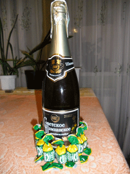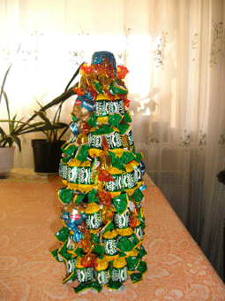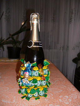 Эта поделка проста в изготовлении и требует минимум материалов. Чтобы сделать этот чудо-подарок понадобятся конфеты и шампанское. А где же креатив, спросите вы? А секрет в том, что у нас получится оригинальная многофункциональная поделка в виде  новогодней елочки. Эта поделка придется по душе всей семье: деткам конфетки, а взрослым – шампанское. Все довольны и не о ком не забыли, а главное – что это поделка, сделанная вами и вашим малышом.