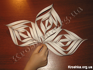 Таким образом склеиваем все полоски поочередно, не забывая при этом каждый раз переворачивать заготовку снежинки.